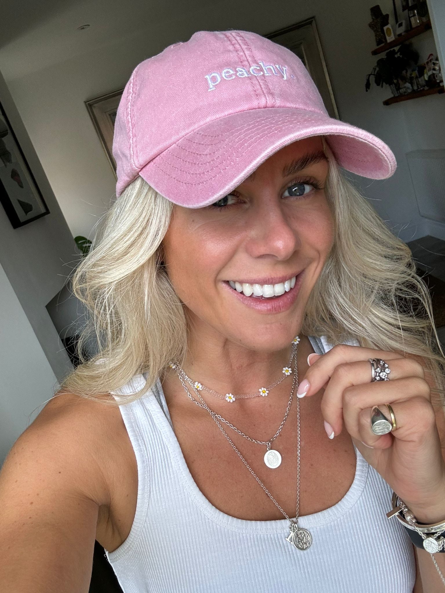 with white 'peachy.' embroidery on the front