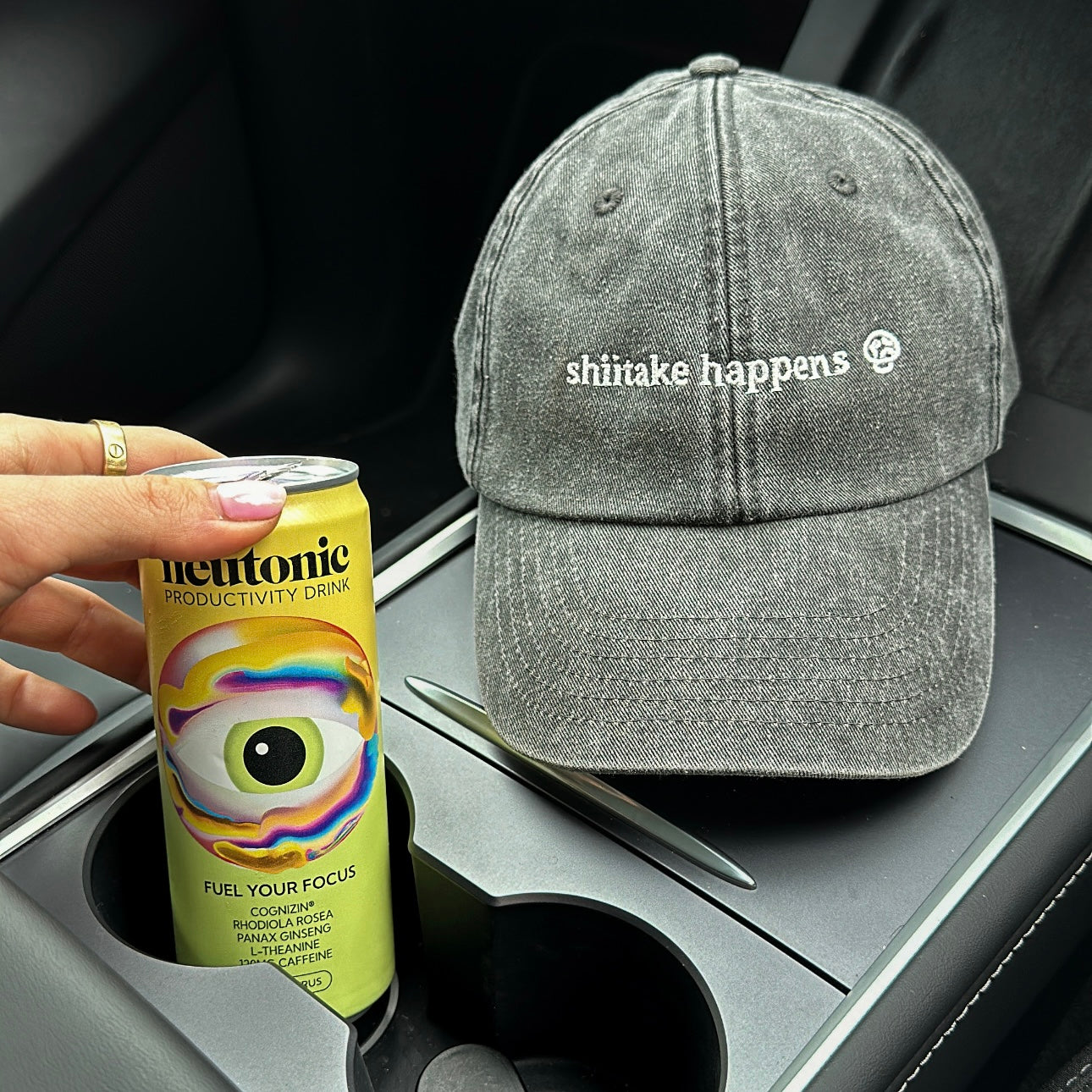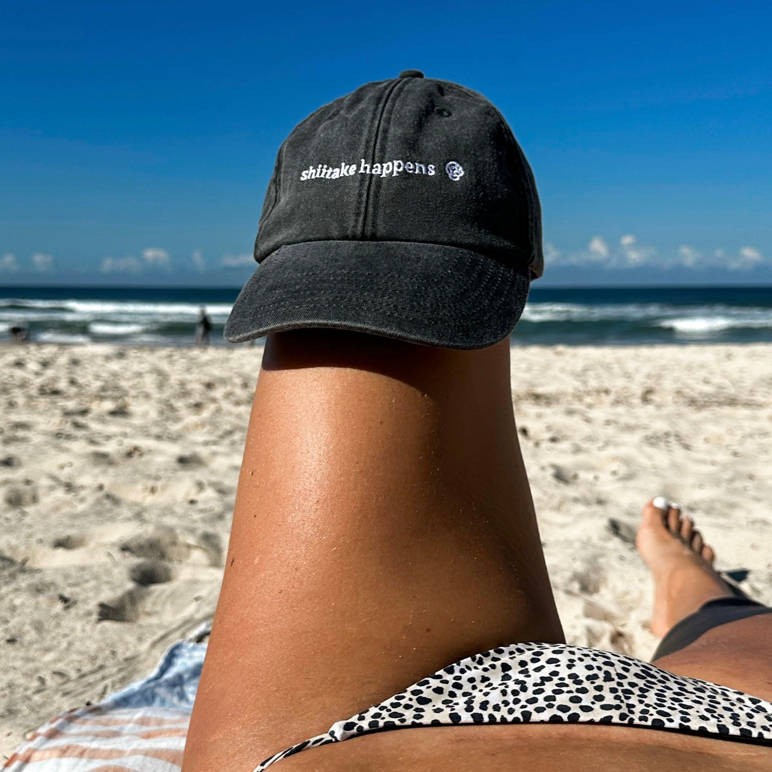 with white 'shiitake happens' embroidery on the front with mini mushroom logo